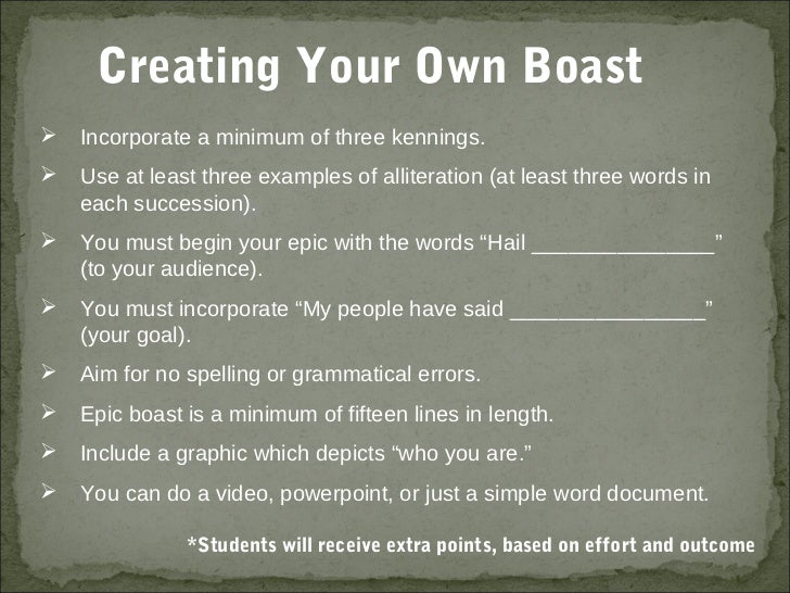 Single-handed I’ll settle the strife. Your assignment is to write a formal boast about yourself. Tell us your deeds, who your daddy/mama are, what you plan to do, and how you’re not gonna take nothing from nobody. Your accomplishments may be academic, athletic, musical, social, artistic, etc. Lay aside your humility!